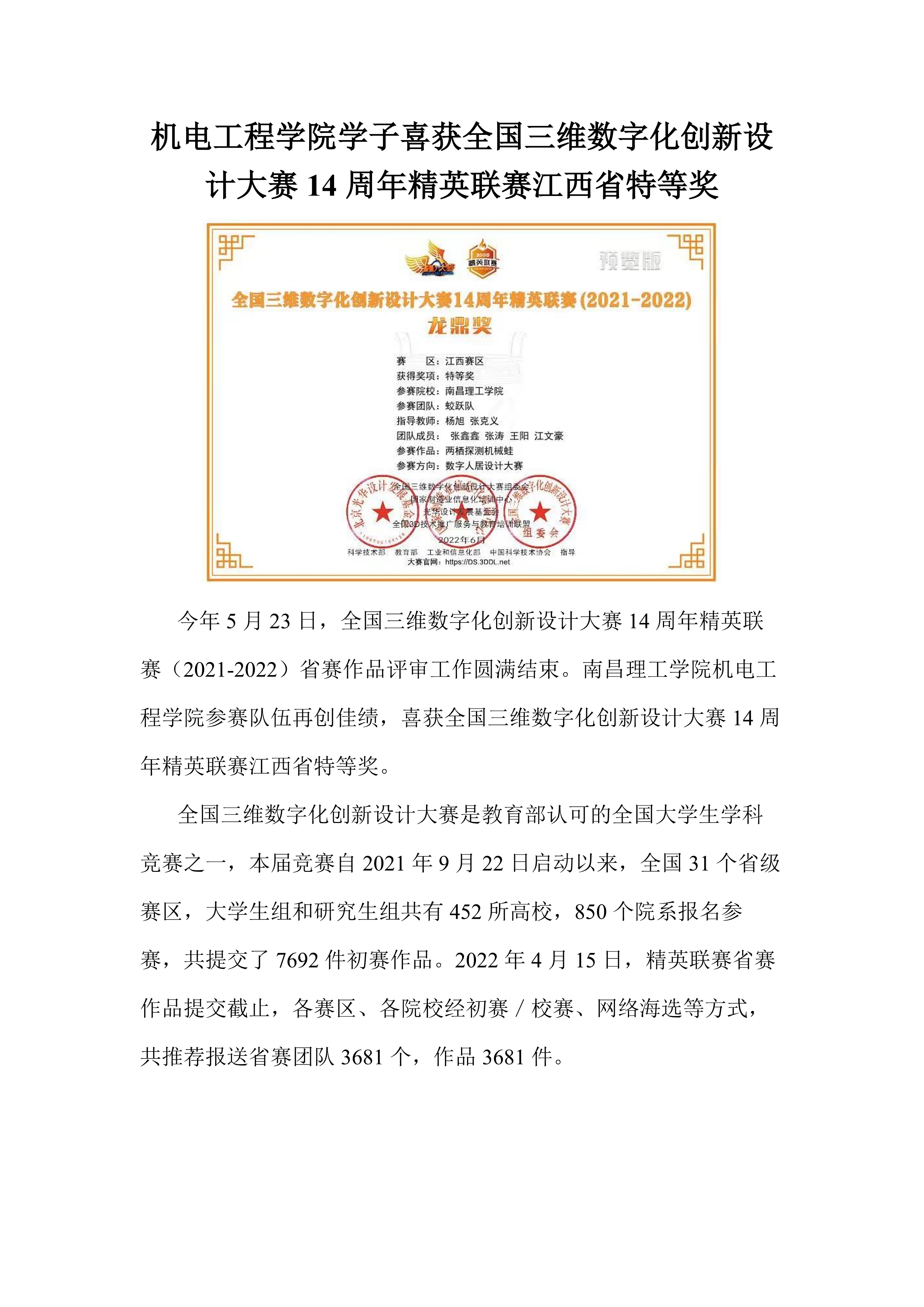 机电工程学院学子荣获全国三维数字化创新设计大赛14周年精英联赛江西省特等奖