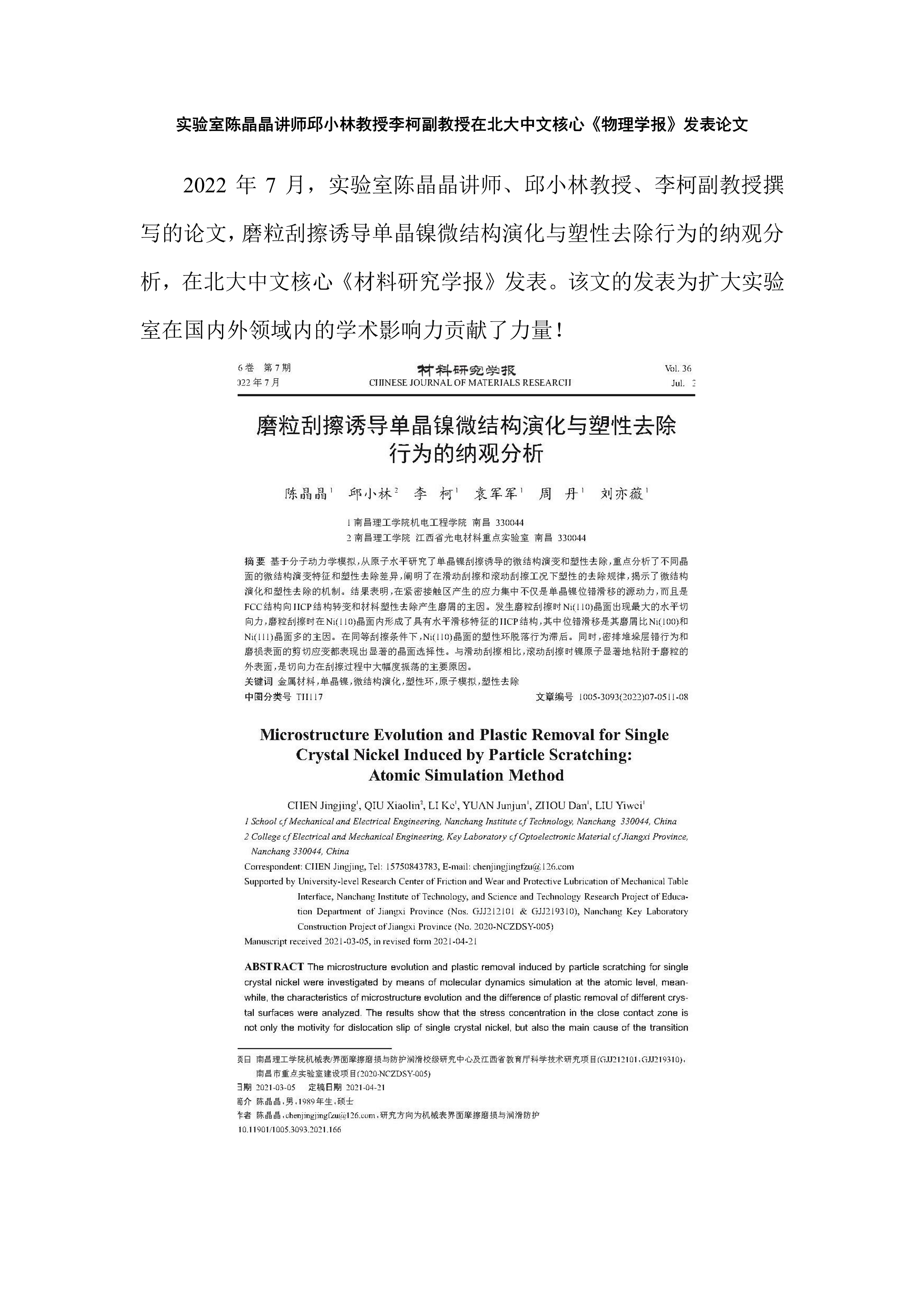 实验室陈晶晶讲师邱小林教授李柯副教授在北大中文核心《物理学报》发表论文