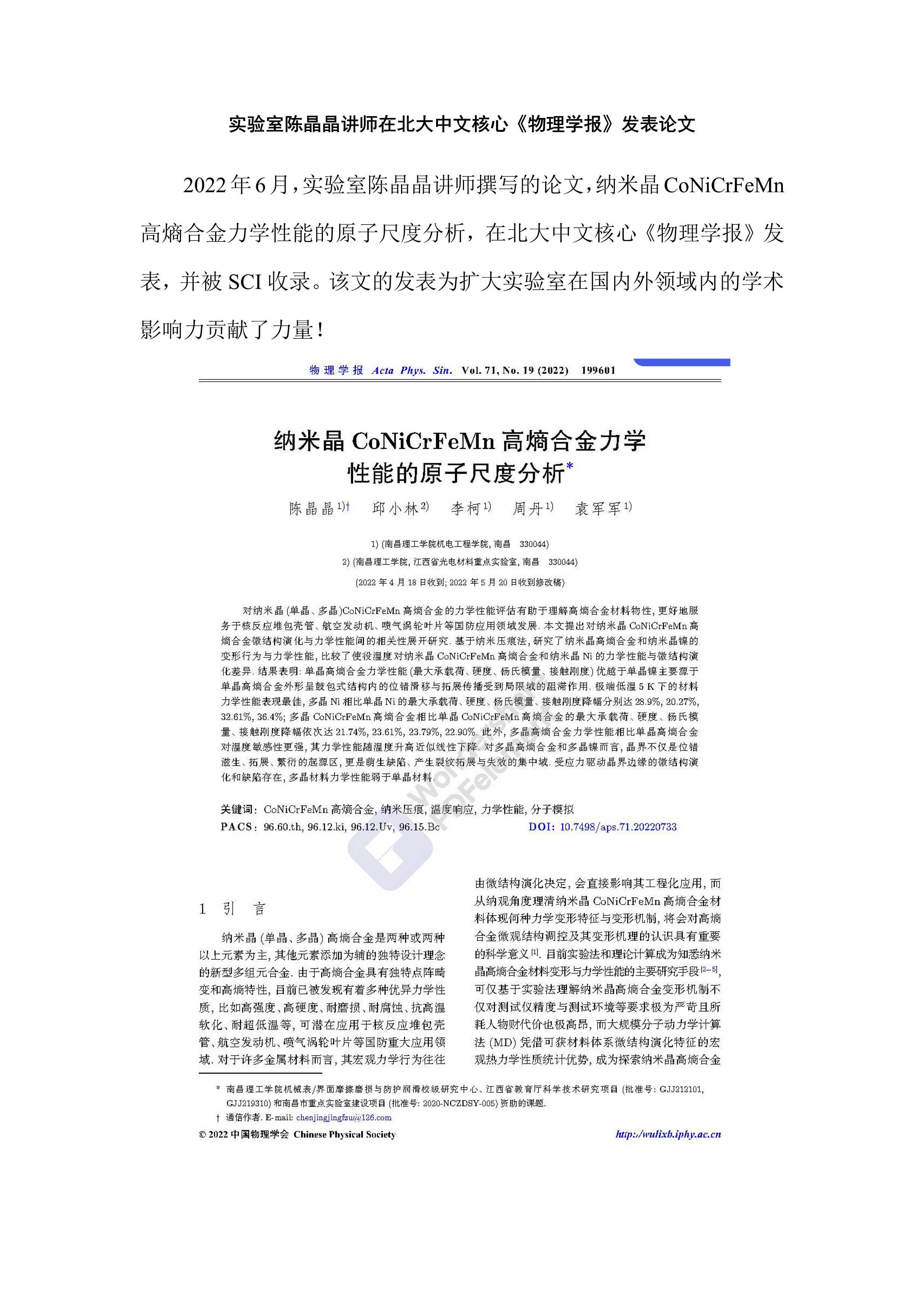实验室陈晶晶讲师在北大中文核心《物理学报》发表论文