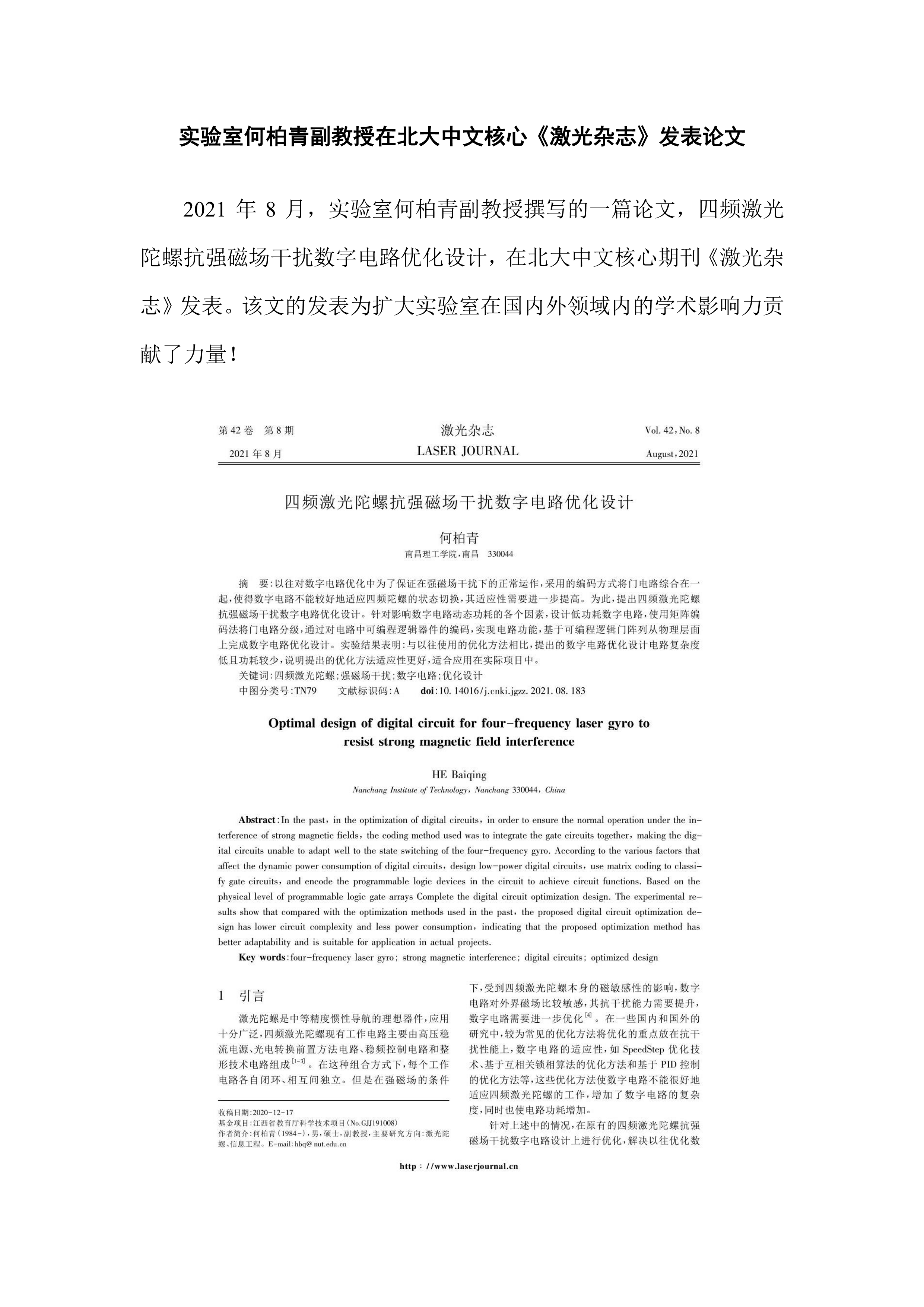 实验室何柏青副教授在北大中文核心《激光杂志》发表论文