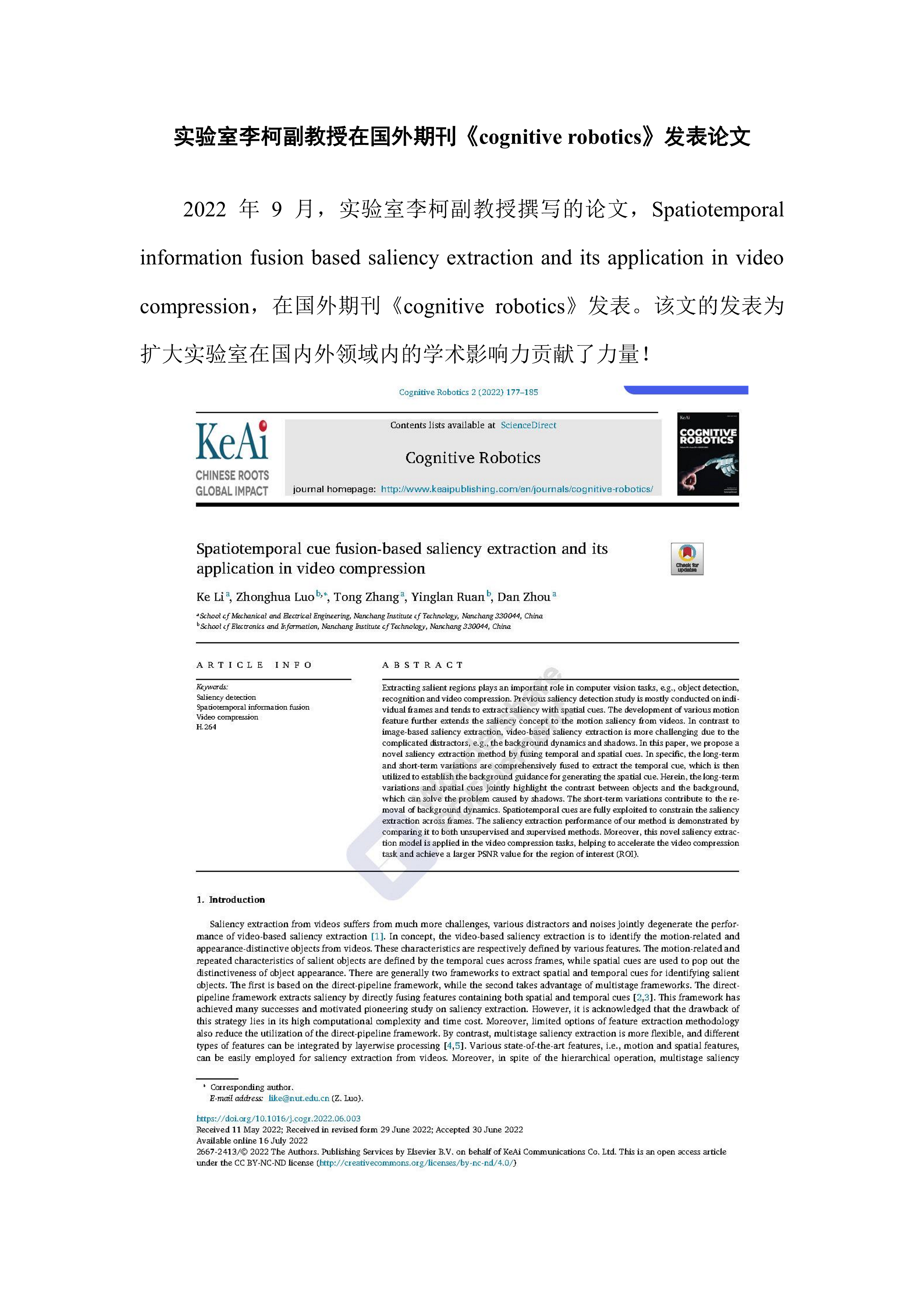 实验室李柯副教授在国外期刊《cognitive robotics》发表论文