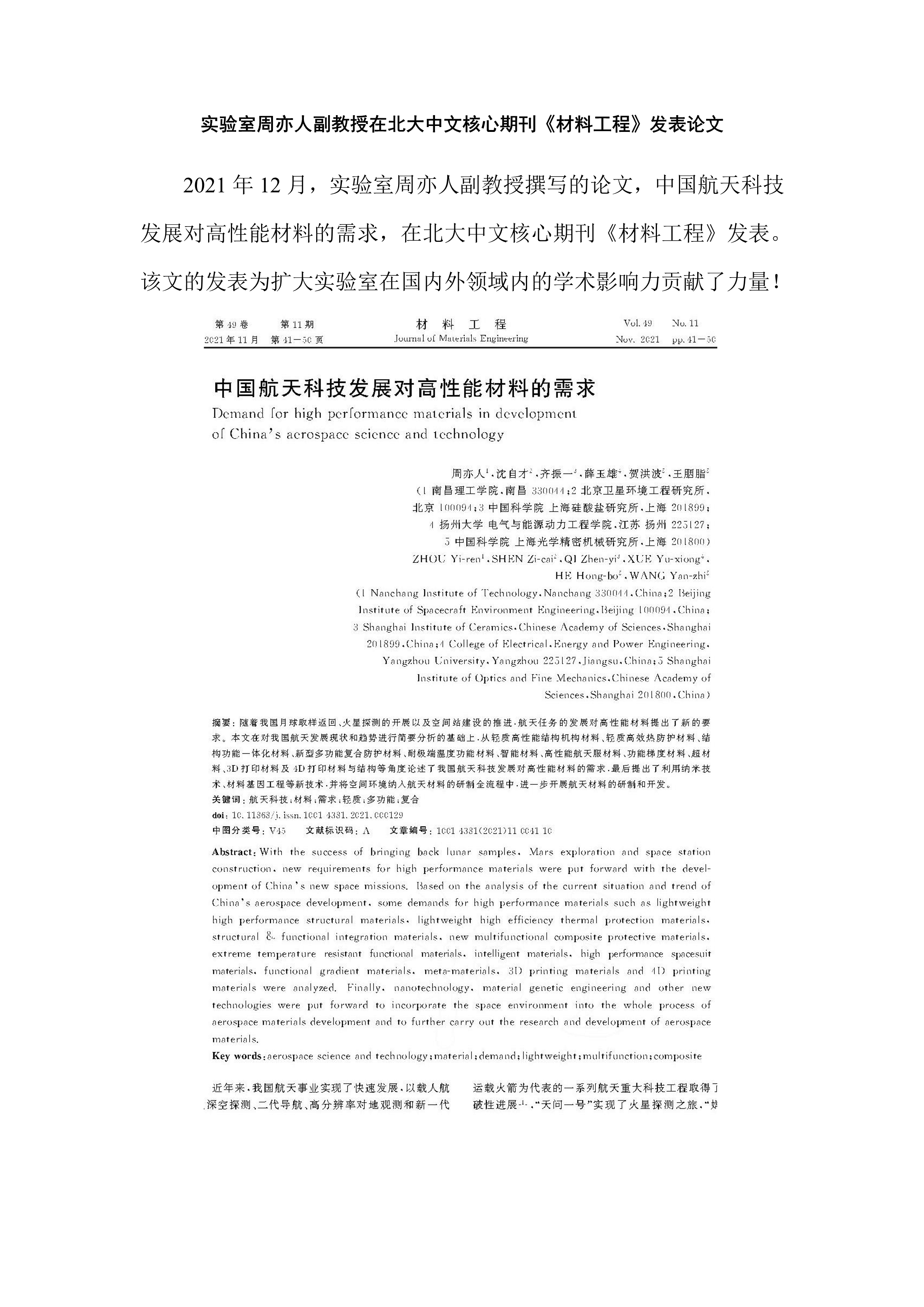 实验室周亦人副教授在北大中文核心期刊《材料工程》发表论文