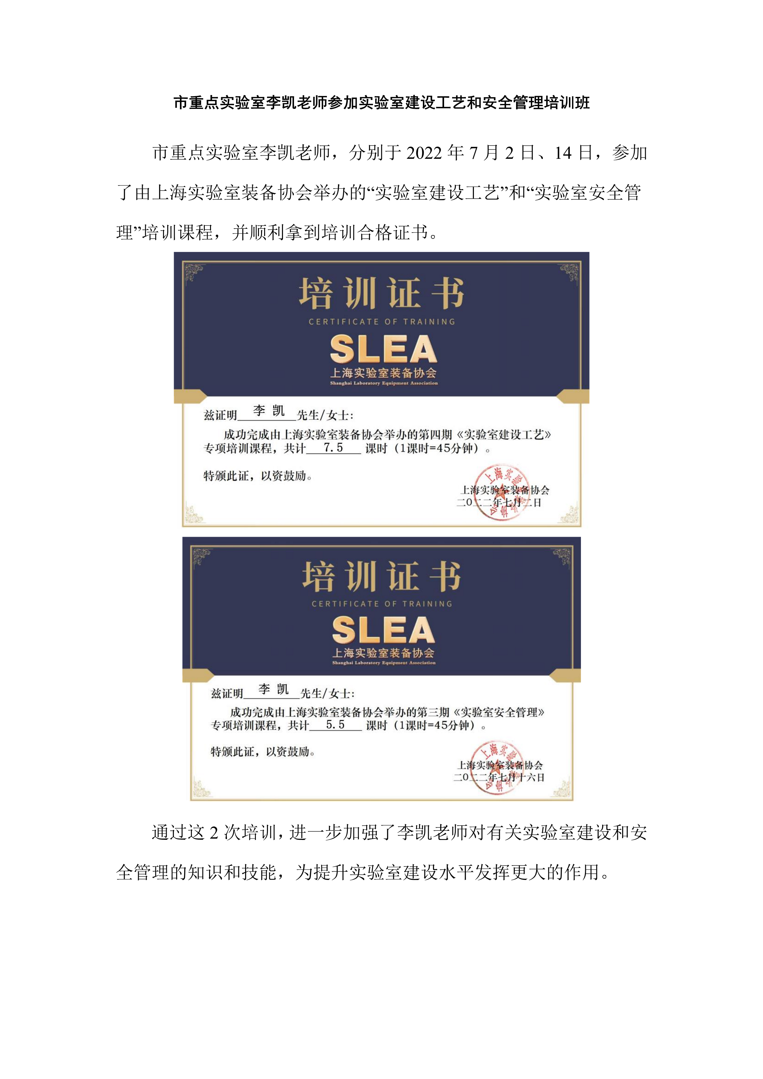 市重点实验室李凯老师参加实验室建设工艺和安全管理培训班