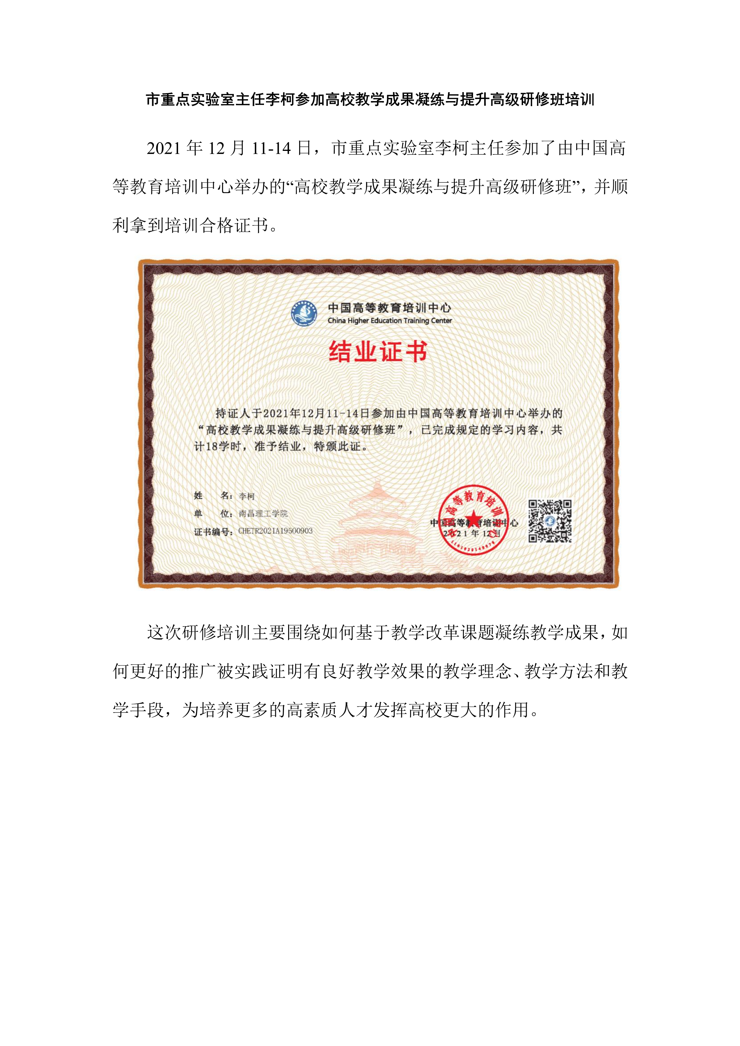 市重点实验室主任李柯参加高校教学成果凝练与提升高级研修班培训
