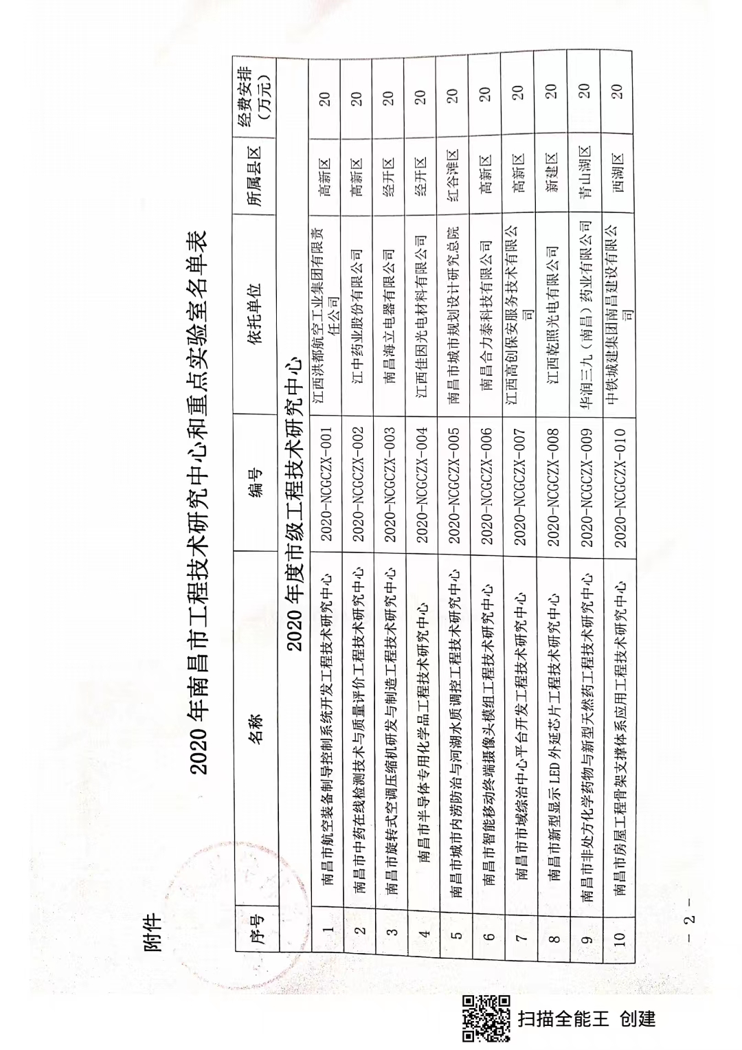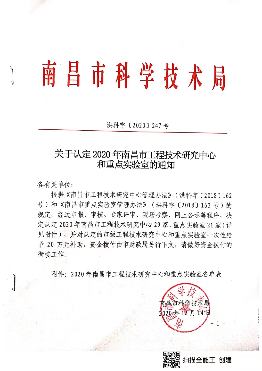 关于认定2020年南昌市工程技术研究中心和重点实验室的通知
