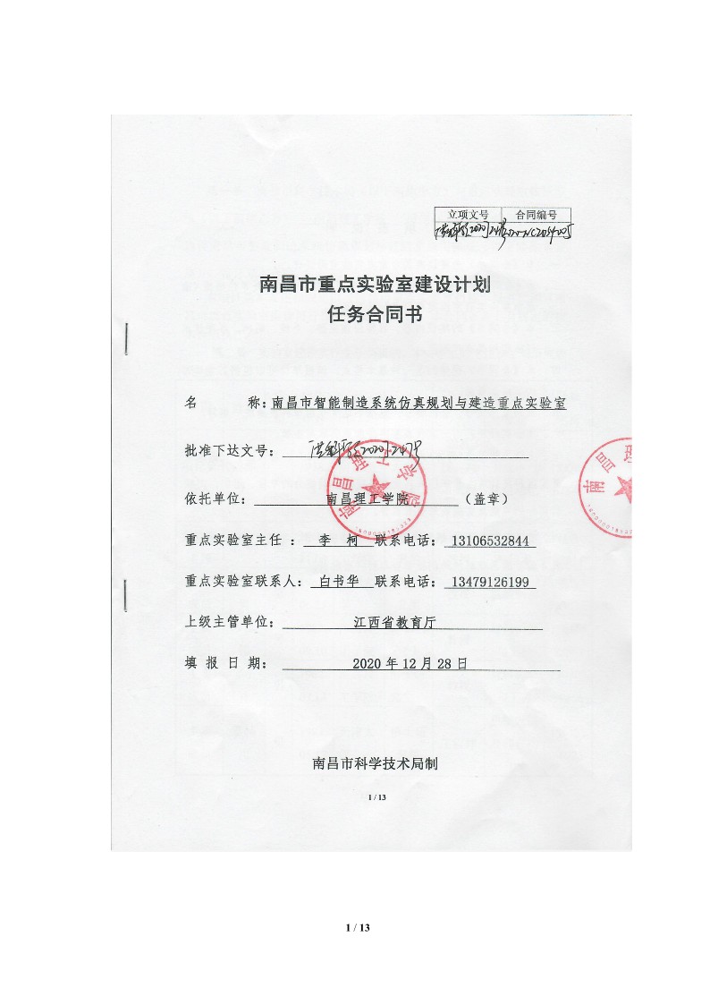 南昌市重点实验室建设计划任务合同书