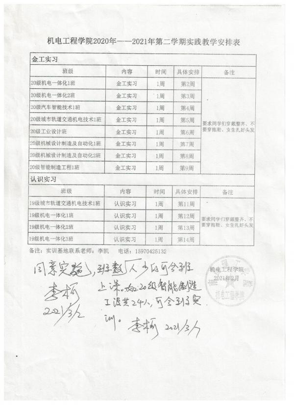 2020-2021学年第二学期实践教学安排表