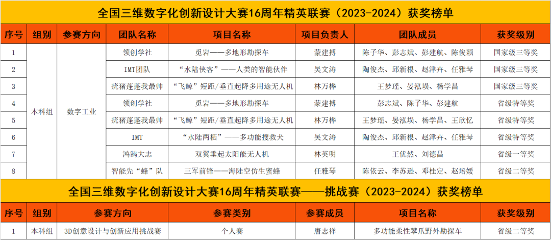 全国3D大赛16周年精英联赛(2023-2024)自2023年9月22日启动以来,全国31个省/直辖市/自治区赛区,研究生组/本科生组/高职高专组有近500所高校,900个院系报名参赛。各赛区、各院校参赛报名团队近8000个,提交初赛作品近12000件。经过初赛/校赛、复赛/省赛层层选拔,本次全国3D大赛15周年精英联赛(2022-2023)总决赛有近500个团队参与角逐全国总决赛龙鼎大奖。据悉,此次比赛参加的院校还有:哈尔滨工业大学、西北工业大学、南京理工大学、南京航空航天大学、华中科技大学、四川大学、西安交通大学、中国人民解放军火箭军工程大学等综合实力很强的“双一流”理工院校。南昌理工学院机电工程学院STE创新工作室:领创学社、疣猪蓬蓬我最帅、IMT团队、鸿鹄大志和智能先“蜂”队,5支团队经过层层选拔,历经10个月进入到全国总决赛,共斩获9项荣誉:全国三等奖3项;省级特等奖3项,省级一等奖1项,省级二等奖2项。
